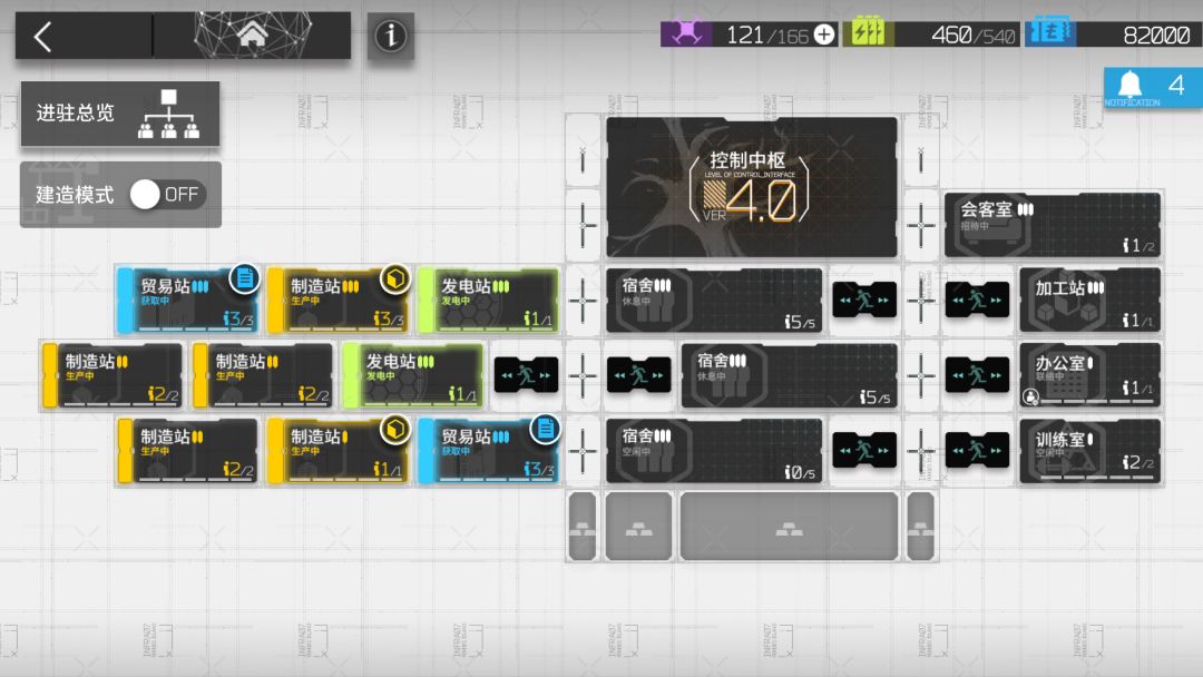 2.为了避免宿舍在换班时休息人数过多,逛基建时可以在宿舍空闲时把中枢、办公室的人换下来休息。