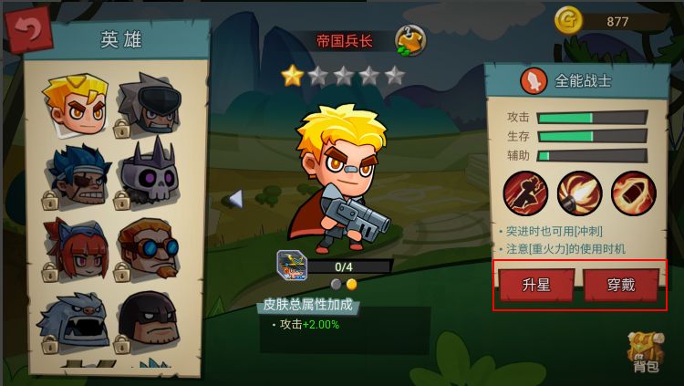 3、点击“穿戴”就可以使用对应的皮肤!点击“升星”就可以使用皮肤碎片升级皮肤的星级,解锁更多酷炫的外形。