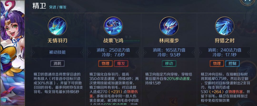 点评:看起来平平无奇的位移技能。配合一技能使用,可调整自身位置并召回羽毛伤害敌人。