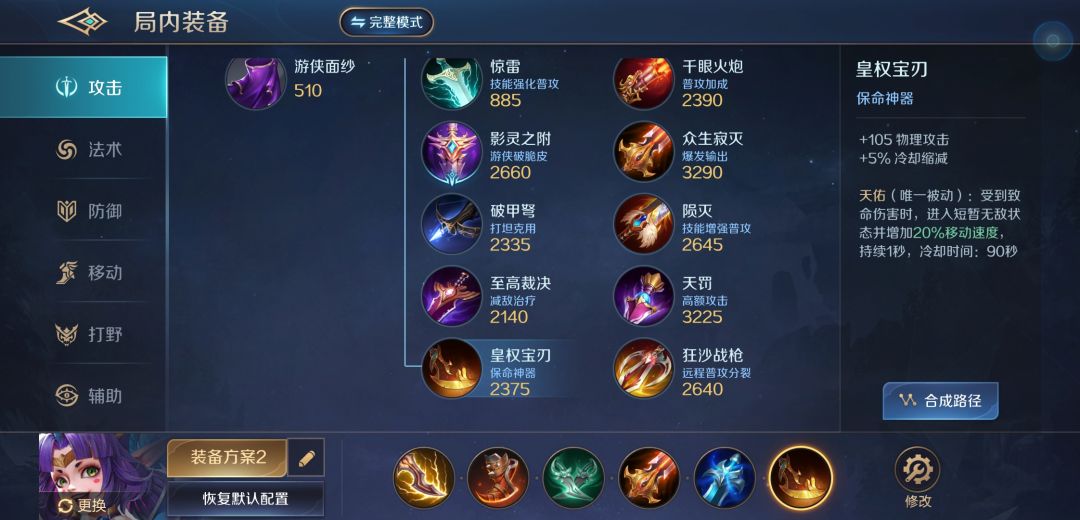 出装我建议出这套暴击移速装,前三件装备加强了暴击、攻速、移速,让精卫变得十分灵活。后三件装备提高了攻击力、吸血和保命能力。打野时,手动预购二级打野刀,出装不变。