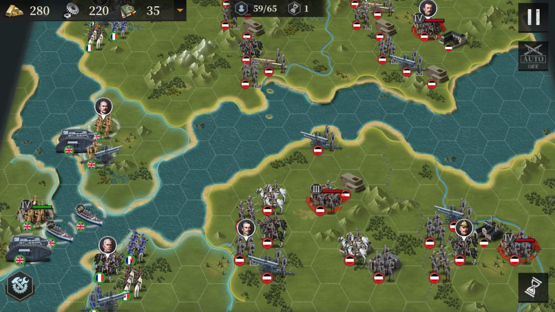 第一回合,给炮兵上将,坦克和胸甲骑兵上将(记得带好回血装备,本关主力就是这3个骑兵),注意下海后不要跑太远,尽快登陆上岸。上方先清理掉要塞,然后左侧的友军会开始行动,帮助推进。下方则是稳步推进,尽量不要陷入包围,能直接收割敌方小兵的情况下也是这样。如果友军还算给力的话,一般下方中间的城市可以先占领,此时就可以出兵防守一下,敌军会有骑兵将领上来,一定不能给机会反推。上方的坦克找好空挡进行绕后,并先站住敌人的出兵建筑,然后下回合再移动躲开要塞攻击。占领上方城市的同时,右下的城市也基本被我方的兵包围了,直接围攻占城即可。