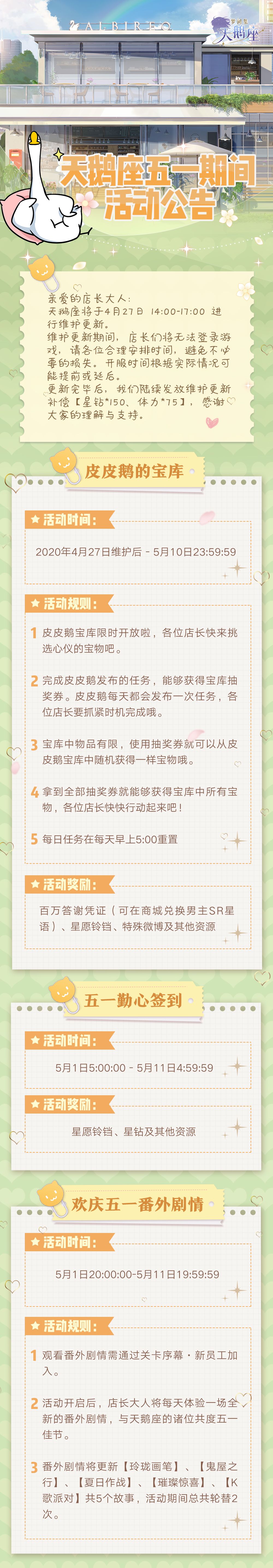 活动规则:活动开启后,店长大人将每天体验一场有趣的番外剧情,与天鹅座的诸位共度五一佳节~