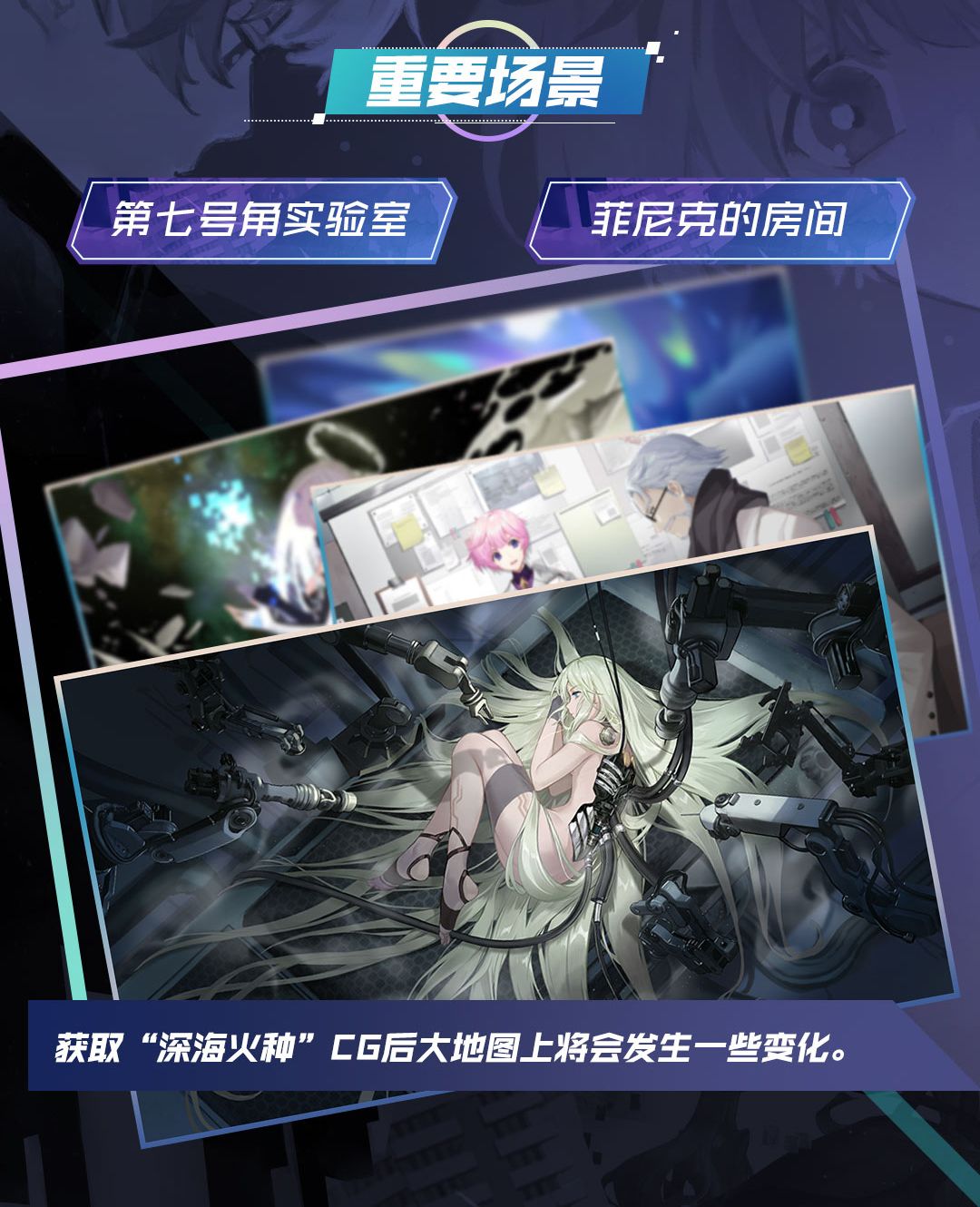 本次剧情中,将会新增场景「第七号角实验室」「菲尼克的房间」 。战争机器少女于前者中诞生,后者见证了天才少年如何测算出黑门后的数据乱流。接下来,少女和少年又将在这些地方作出怎样的选择呢?