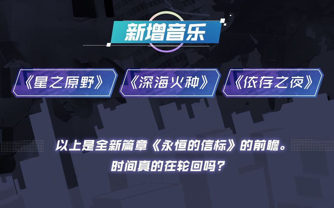 同时,随着新篇章的更新,将新增音乐三首《星之原野》、《深海火种》、《依存之夜》。