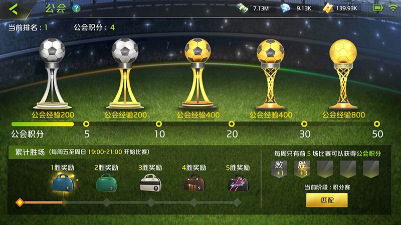 公会战在每周五至周日晚7点到9点开启,每名成员胜1场积3分,负1场积1分,每周只有前5场比赛才可以获得公会积分,所有成员获得的积分总值达到要求后,可以获得对应的公会经验,公会经验可以用来升级公会,公会等级越高,公会可以容纳的成员人数上限越高。除了参与公会战的匹配可以获得公会贡献之外,在累计胜场个人礼包里也会包含公会贡献奖励,消耗贡献兑换SS球员包及一些非常实用的功能性道具,还是相当有吸引力的。