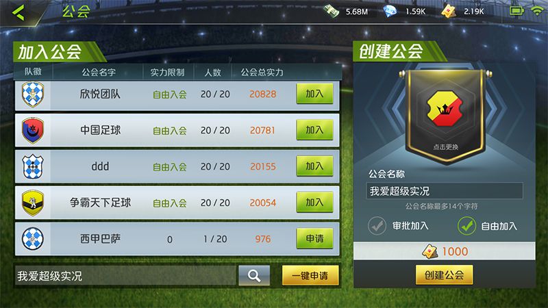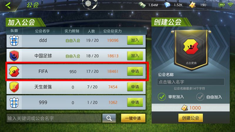 滑动主界面进入右侧的公会系统,在公会列表中选择你想加入的公会,公会列表的顺序以公会的总实力(所有成员的默认阵型实力总和)依次递减。部分公会会设置实力限制门槛,球队默认阵型实力达到规定的数值才有资格申请加入,而且需要得到公会管理层的审批。相对应的,自由入会即是指玩家只要申请,就可以立即加入该公会。