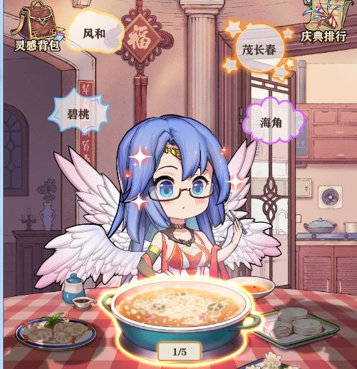 在团长大人们收集完祝福饺子后,需要将祝福饺子以不同组合投入烹煮的锅中,加百列会因为美味的饺子而产生各种灵感气泡,团长大人可以通过点击气泡收集加百列关于春联的奇思妙想。