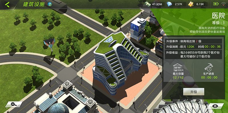 医院在球员受伤的时候可以提供科学的护理,帮助球员加速恢复,升级医院可以提升产出医疗包的效率。