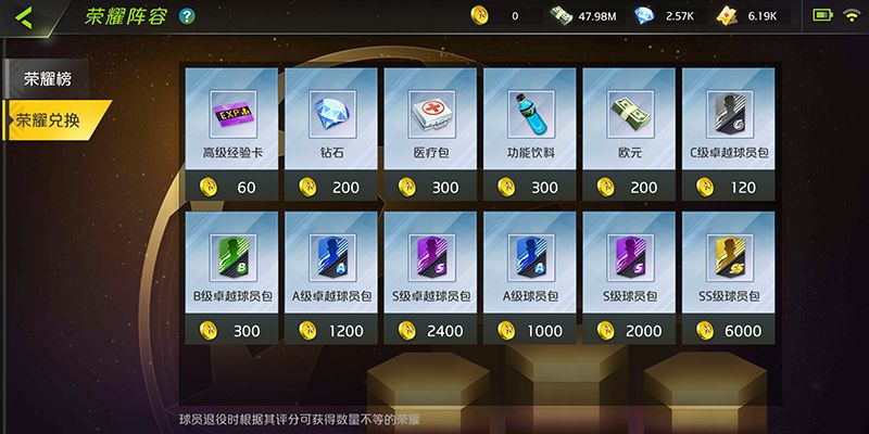 球员退役时根据其评分,玩家可获得数量不等的荣耀币,消耗之后可以在荣耀兑换界面兑换到SS球员包及一些实用的功能道具。