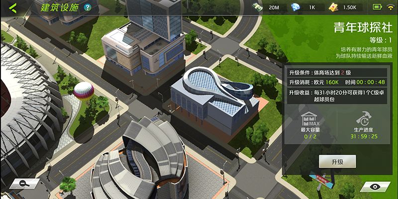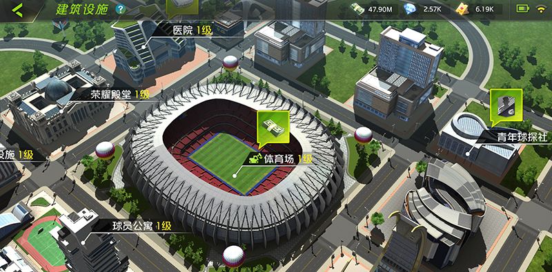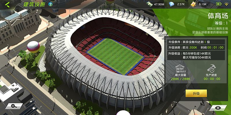通过主界面底部的设施按钮可以进入建筑设施系统。体育场作为球队主场,是俱乐部的基础设施,升级体育场可提供更好的赛事体验,每隔一段时间就可以产出高额的欧元,让我们有足够的资源执行球员签约、设施升级、球员训练、普通球探等各项事宜。另外,体育场作为整个设施系统的主建筑,与各个副建筑之间的等级差不能超过1级,也就是说升级其他建筑之前必须先优先完成体育场的升级。