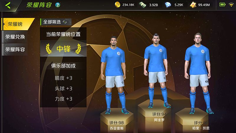 当荣耀榜的每个位置至少拥有2名球员,即共24名球员之后,将开启荣耀阵容功能。系统将从24名球员中自动选择11名球员,按照4-4-2的阵型进行配置,玩家可以手动更改阵容。