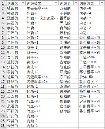 切入正题,不同的词缀带来不同的效果,然后在下就比较好奇的想知道《模拟江湖》中到底有多少词缀,然后的然后,就在1.1.7版本(bug江湖)中通过模拟器脚本进行了大量样本的搜查,得出了部分词缀名及其效果,看着现在已知的词缀个数,预估起码得八十多个词缀以上,《模拟江湖》策划大大们真的用心了。下面就是目前已知的词缀名,有知道别的词缀名的朋友们可以进行补充说明