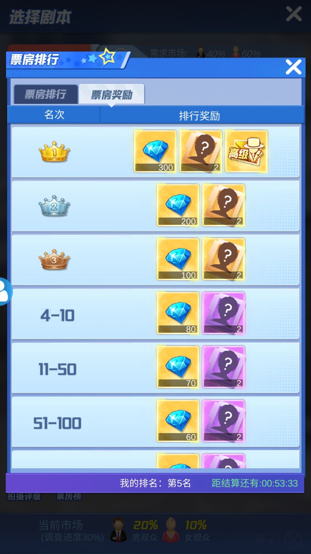 第二部分要说的就是票房,票房是每日都进行结算的,你要是有条件冲进前三,随机碎片志在必得。在以后的冲榜啊,随机到自己需要的人物可以有大幅度的提升,在打不过人物的时候也可以你补掉你短时间内无法提升实力的情况。