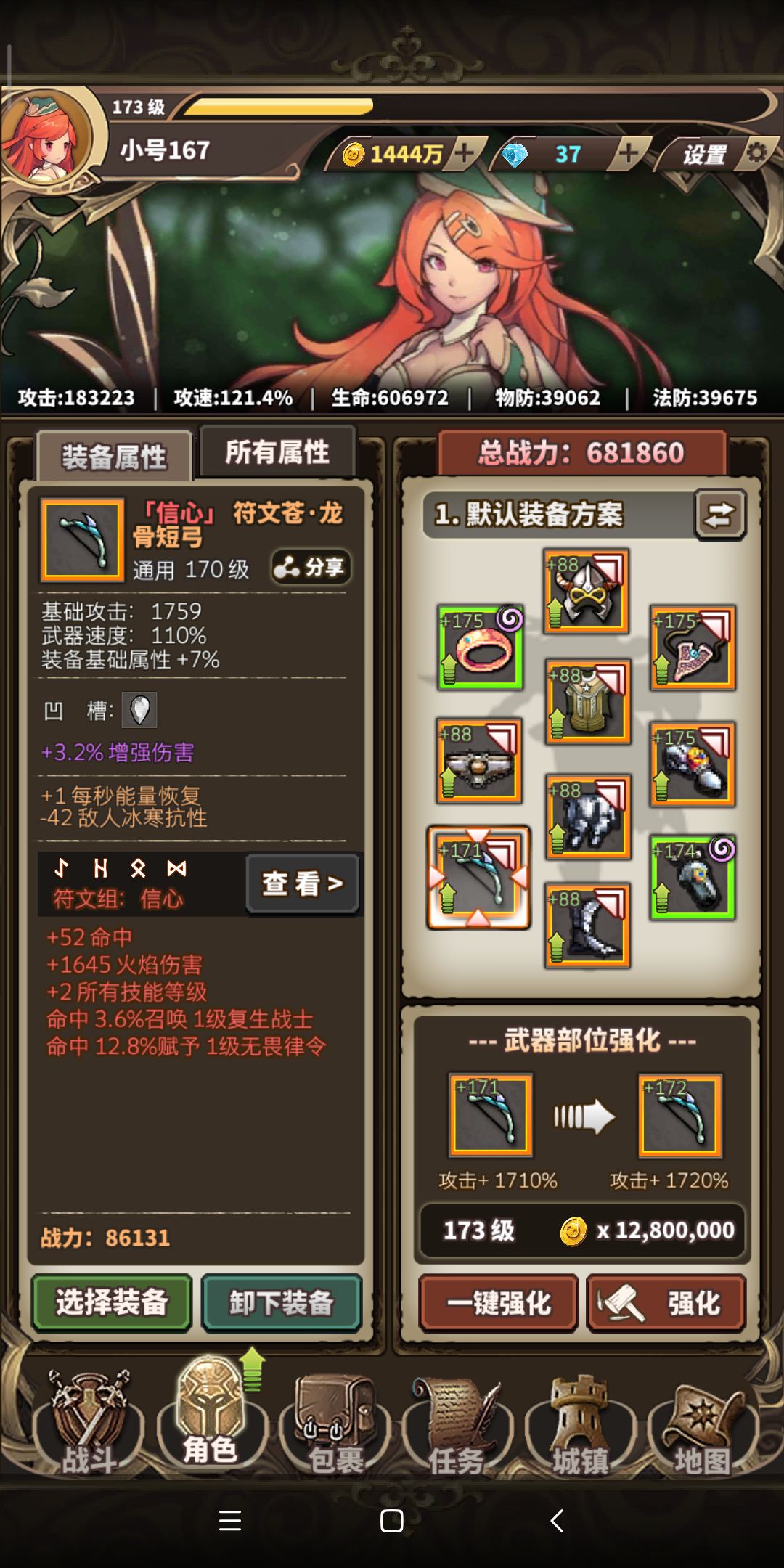 首先说一下,和老玩家最大的区别有两点,第一就是我没有完整的套装,装备强化等级也都没满级。第二呢,就是从我开始玩以来这个游戏就有符文系统,所以我算是更接近于现在的新手玩家。首先我必须说明的就是装备强化,个人认为绿帽的精髓就是玻璃大炮,以攻代守,所以防御完全没有必要去加,是完全没必要,我的强化等级在这里