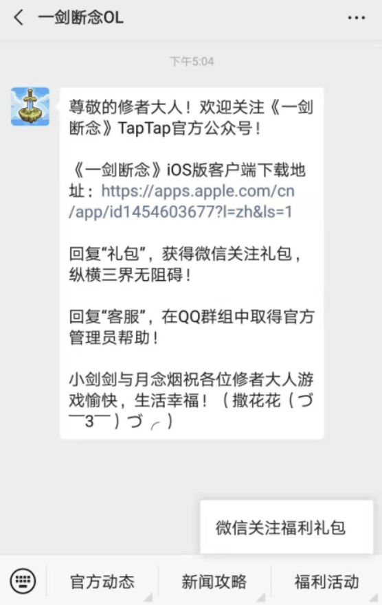 首先请您在微信中搜索:一剑断念OL ,关注《一剑断念》Tap官方公众号;在进入公众号后,您可以通过在微信公众号回复:“礼包”来领取,请妥善保管您的礼包码,以便登录游戏领取。