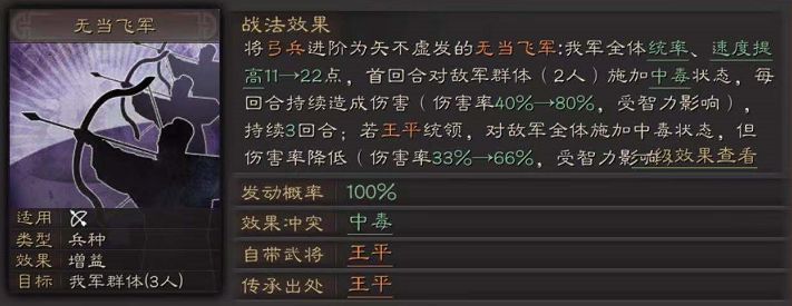 无当飞军:战法为谋略伤害,可受谋略增伤、智力加成、攻心、奇谋等增益战法的提升;值得一提的是伤害类型为持续性伤害-中毒,稳定的debuff可与程昱主动技联动,此外中毒还是为数不多的满足克敌制胜二段效果的debuff之一,所触发的虚弱效果堪称最强“减伤”。