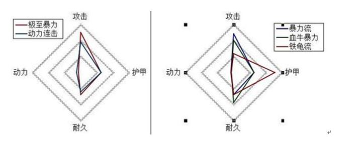 先上一张本文要说的五种流派的实战属性侧重图。注意这里的属性不仅是上层战斗舱的的四大属性,更包括了游戏达到一定等级以后的战船、水手、晶石、宠物、装备加成。说是极致,但并不等于你不建某属性的船舱这艘船就完全没有这个属性。在同等资源条件下,游戏中攻击、护甲、耐久、动力之间的权比是1 : 1.25 : 12 : 0.5,下表的数值都是除以这个权比后的数值。