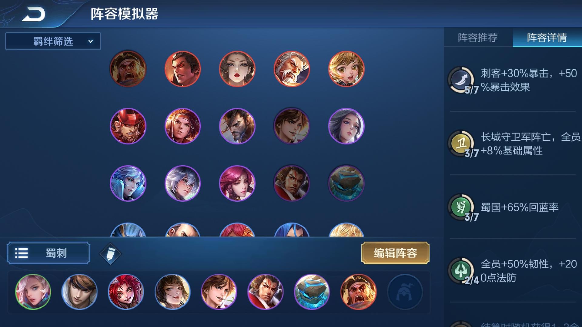 这个阵容很舒服也是我常用的一套必拿元哥、赵云,利用蜀国两刺客再凑一个张飞形成三蜀,玄策、李白、上官是主力输出因为有玄策再凑两个长城凑长城羁绊,如果有玄策守约天赋把苏烈换掉这个天赋真的很强,建议张飞守约(苏烈)炖山放第一排五刺客放最后一排两个长城死了还有属性加成,装备优先玄策,能升玄策一定要升玄策!上次我三星神装裴擒虎打不过两星无尽饮血的玄策