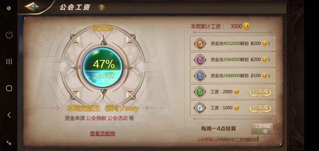 公会工资指的是公会每个星期会给全体玩家发放一定量的金币,金币的数量取决于这个星期公会所有成员对公会做出的贡献,看下面的图。所以,请务必找一个人多活跃的公会,当然你能混个官员副会长啥的,还能有工资加成。初期如果不花钱战力可能跟不上,有很多大公会可能会有入会战力要求,没关系,平民玩家抱团也很厉害,最重要的是活跃度高!