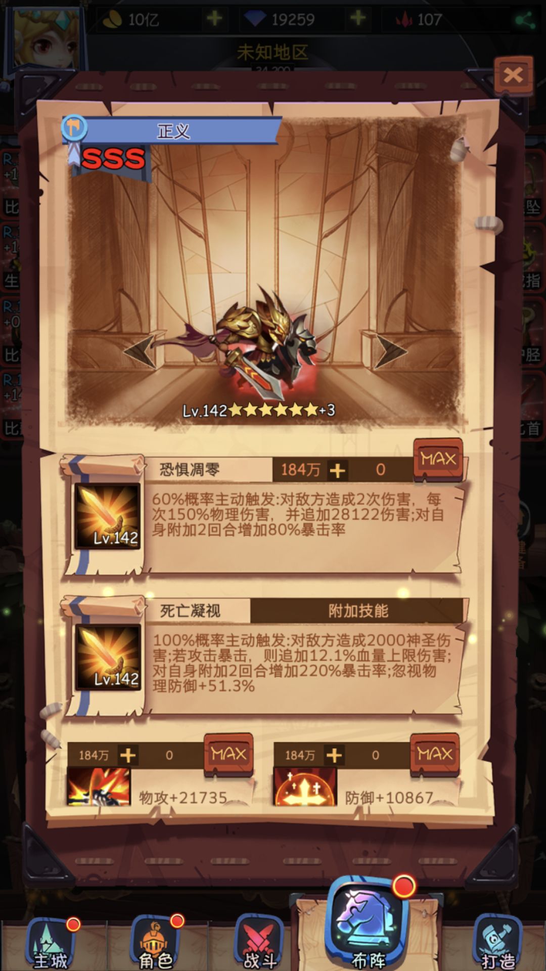 二转推图觉醒正义很好用,我只觉醒了正义和圣光(狮子今天刚觉醒完成),35天推完了34-200。在推图过程中感觉到觉醒正义的忽视物理防御是没生效的,如图142级的觉醒正义忽视物理防御51.3%