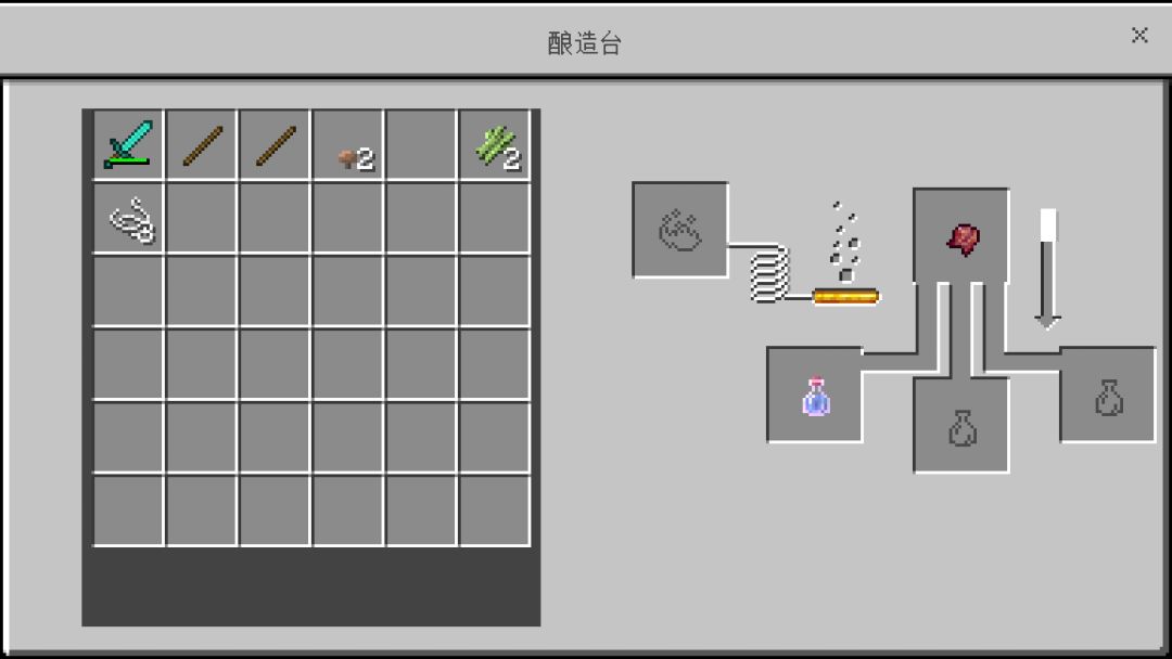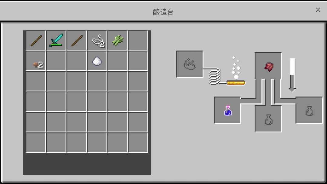 接下来是两个效用对立的药水,迅捷药水和缓慢药水~关于迅捷药水的制作方法,第一步想必冒险家都想到啦,没错!首先将水瓶和地狱疣酿造成粗制的药水,然后把甘蔗做糖,将粗制的药水和糖一起放在酿造台酿造,就成功啦~