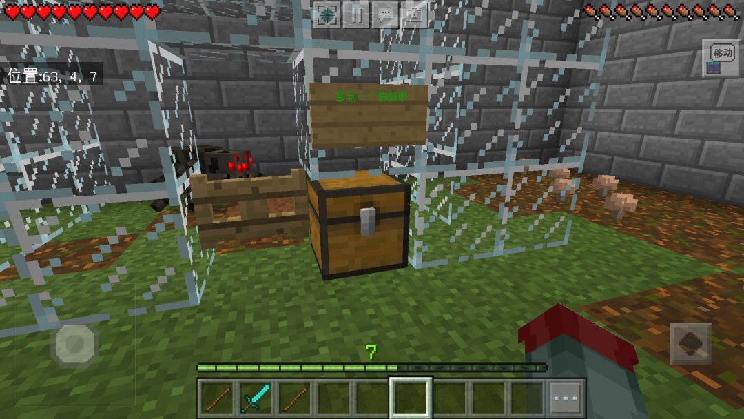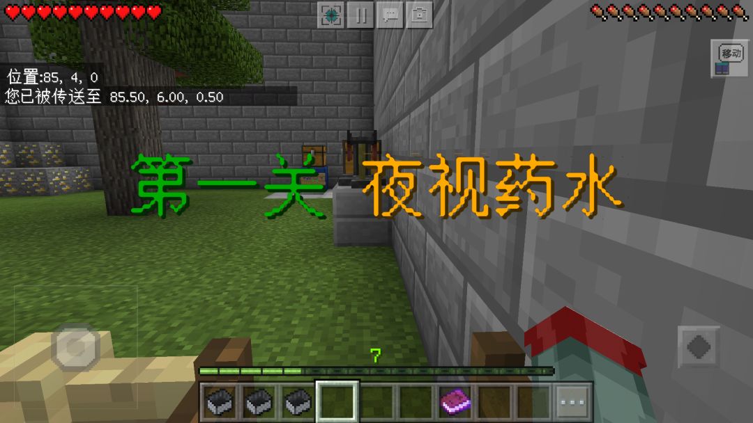 第一关是教我们制作夜视药水 (`ω´*) 首先我们要挖金矿,烧成金锭,做成金粒;再收集胡萝卜,把它和金粒一起合成金胡萝卜;然后采集地狱疣,在酿造台和水瓶练成粗制的药水;最后把粗制的药水和金胡萝卜放在酿造台里酿造,就这样,夜视药水就酿造完成啦~
