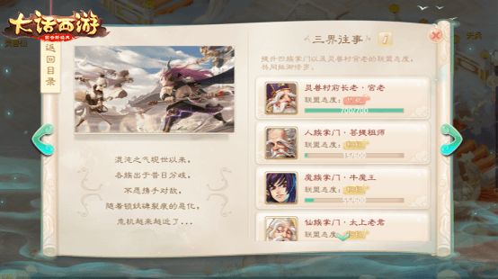 4月11日-5月9日,“三界往事”活动上线,等级>=35级的玩家可以在活动面板-三界往事-三界往事打开界面参与。玩家可以通过日常活跃度获取活动道具,并通过游说和追忆两种方式,提升五人对联盟的态度。