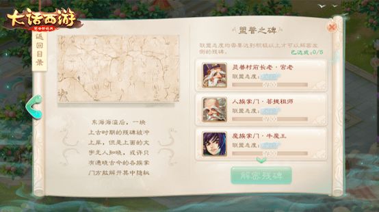 东海海溢之后,一块上古时期的残碑被冲上海岸,然而碑上书写的文字却无人知晓,似乎只有通晓古今的各族掌门才能解锁其中奥秘。,当四族首领及灵兽村前长老的联盟态度到达一定程度之后,玩家才能解锁神秘的“盟誓之碑”。届时,全民将携手解译碑文,共同探寻未知的秘密。