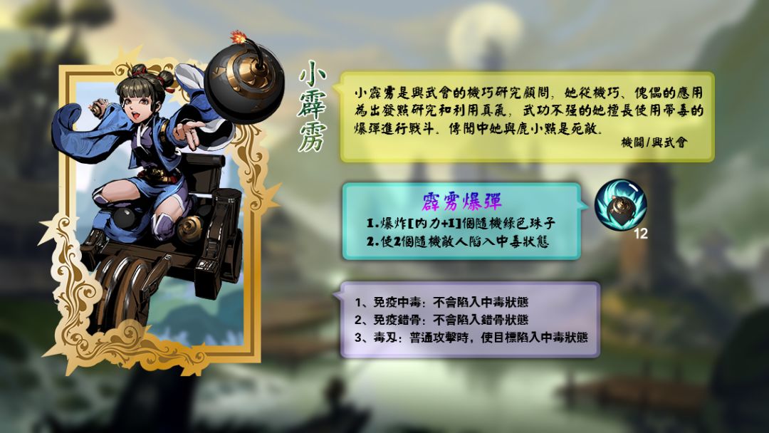 小霹雳是兴武会的机巧研究顾问,她从机巧、傀儡的应用为出发点研究和利用真气,武功不强的她擅长使用带毒的爆弹进行战斗。传闻中她与鹿小点是死敌。