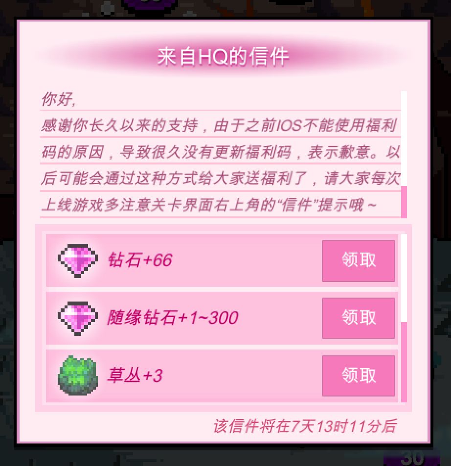 嗨~大家好,福利有了新的方式,更新到新版本后,在关卡界面的右上角点击信件图标,即可。