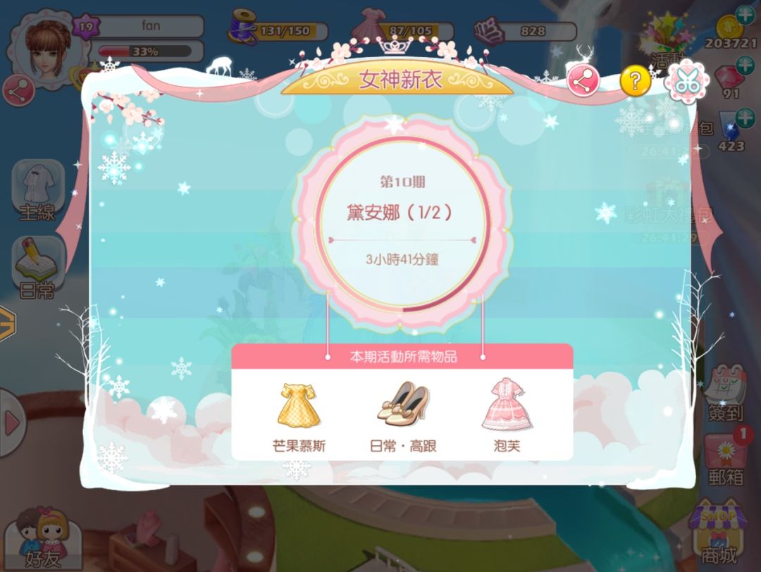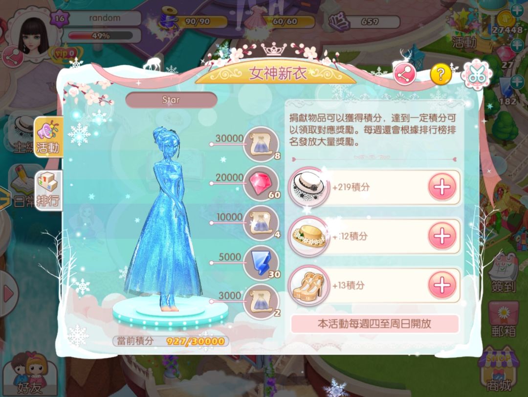 每周四到周日,会开放女神的新衣物资竞赛活动,每周有3种物资供女王们提交换取积分,积分越高,越能够一点点解锁前任女王冰冻的魔咒,并最终获得时装图纸奖励、钻石、体力等等,排名前三名的玩家还有特殊奖励哦!