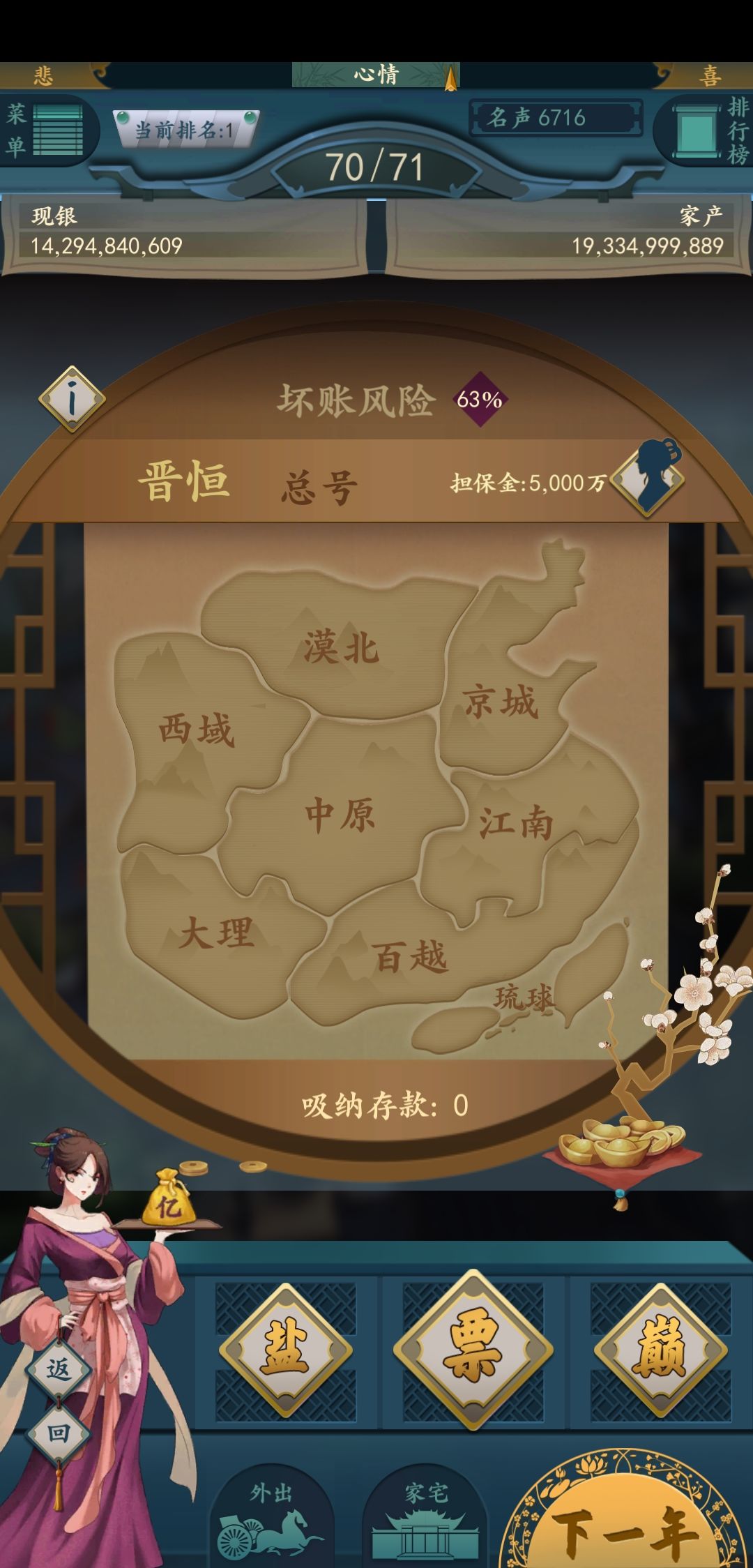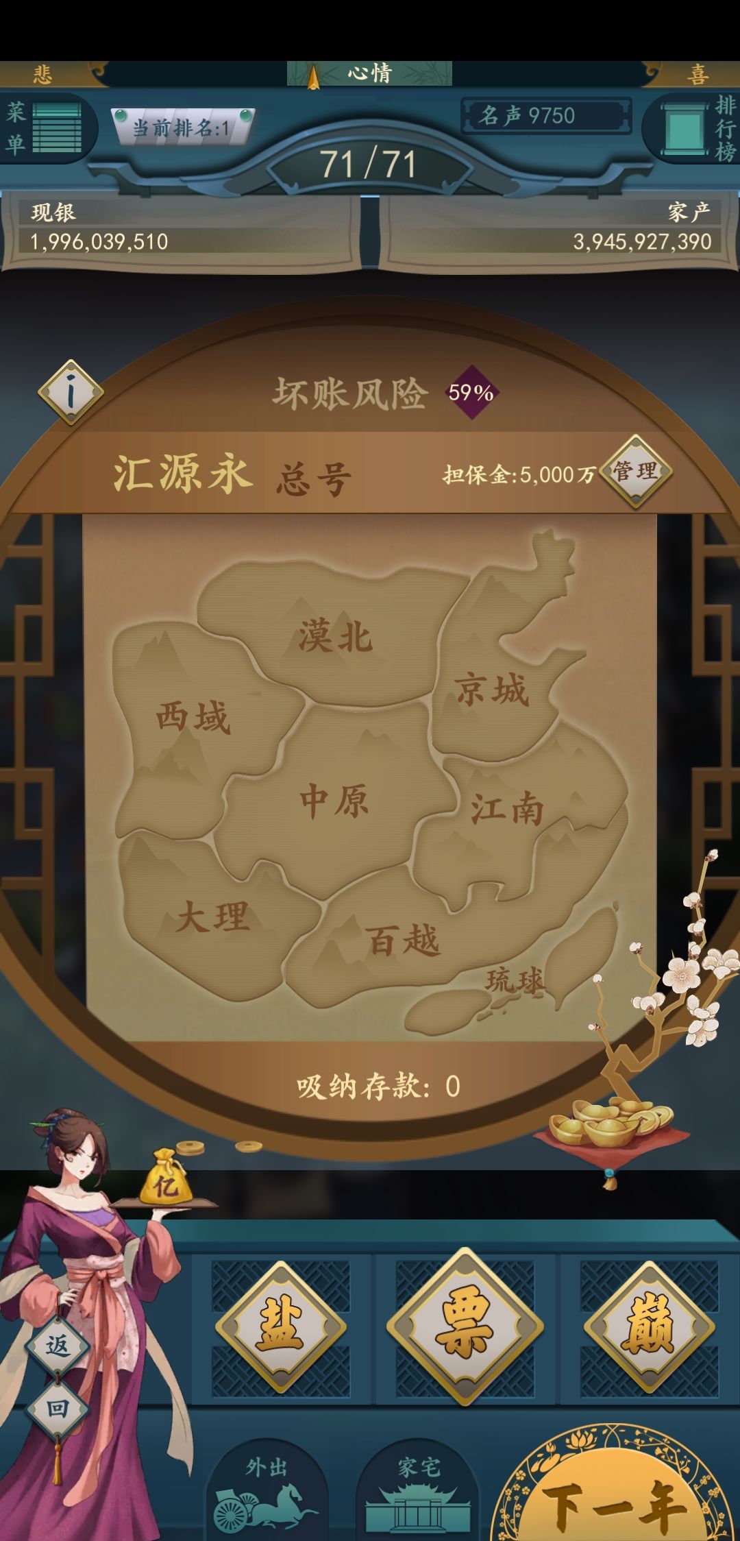 风险到底是跟什么有关呢?有帖子说跟名声有关,测试了一下跟名声应该是没关系的。跟妻子子嗣应该也是没关系的我测试的时候把妻子都休了第二年也没掉风险。总的感觉就是开了钱庄之后风险会一直升,你一直观望它就一直升,升到50左右并且不会掉下2-30了,个位数风险更是没见过掉下来。有大佬研究过这个钱庄的风险吗?