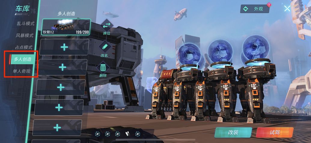 1、暂时只有创造模式可支持多武器开火。也就是【多人创造】和【单人奇观】的车库可以支持。当然也只支持同类型的武器进行合并,以下用多人创造的车来举例。