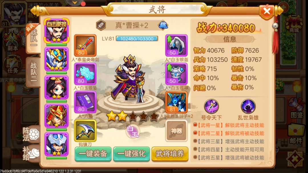 打法二:有高血量五星周泰,那么使用周泰诸葛魏延乐进孙权,速度无要求,周泰一诸葛二就行,除周泰外集体裸奔,控住一个让另一个放大,可快速解决战斗,孙权一星即可,放大防止眩晕,容易翻车,但打得比较快。