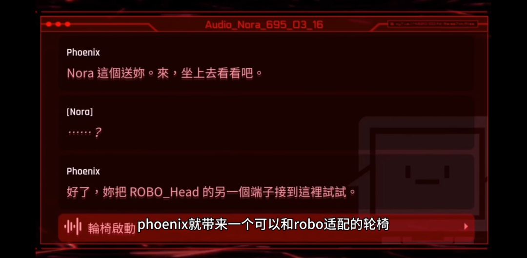 正说到这里,phoenix就为nora带来了一个可以和robo_head适配的轮椅,这样nora就可以控制自己随意的移动了,她的活动区域也变得大了起来,她马上就学会了人生中第二个表情,开心,不过距离土竜给phoenix的期限越来越近,nora终究还是在一次偶然的机会,知道了自己将要被废弃的事情。