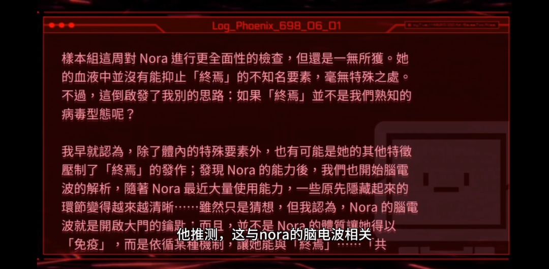 并且phoenix猜测,nora并非免疫体质,只是找到了和病毒共存的方式,他推测,这与nora的脑电波相关,如果能收集更多使用能力时脑电波的数据,也许实验会有新的进展