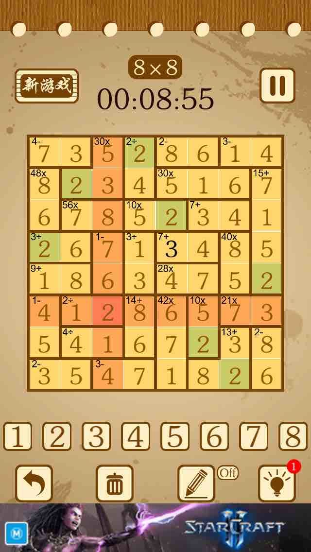 进阶模式算是比较有新意的,类似的加和式的数独以前也在网上玩过,加减乘除全部混杂的就比较少见了。难度也不是太高,因为自动生成的缘故偶尔出现卡关,需要分类讨论的时候也可以用提示解决,个人比较喜欢这种做法,毕竟不是什么时候手头都有笔纸。