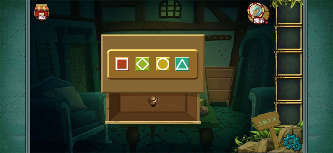 拼成这样就差不多了 完成后得到一把刀然后记住下方的糖果提示 之后会用到(小伙伴玩这种游戏的时候看到可疑的提示都可以注意下 后面都会用的到的 ) 然后点击台子上方的水井 可以看到一个颜色提示记下来 然后拾取水桶