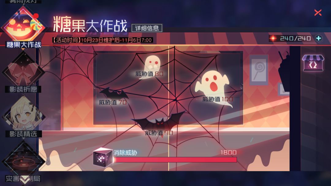 每种糖果需要3种材料制作,制作棉花糖需要细砂糖、明胶和能源晶体;制作樱花糖需要细砂糖、樱花和能源晶体;制作巧克力需要可可、鲜奶和能源晶体,不同糖果所需要的各类原料数量也不同,原材料存放在5个仓库中。每帮助一位神器使完成一批糖果的制作,将解锁一次糖果配送,完成六批糖果后可以获得该神器使的万圣节表情,完成六次糖果配送后可以获得该神器使的挂饰。