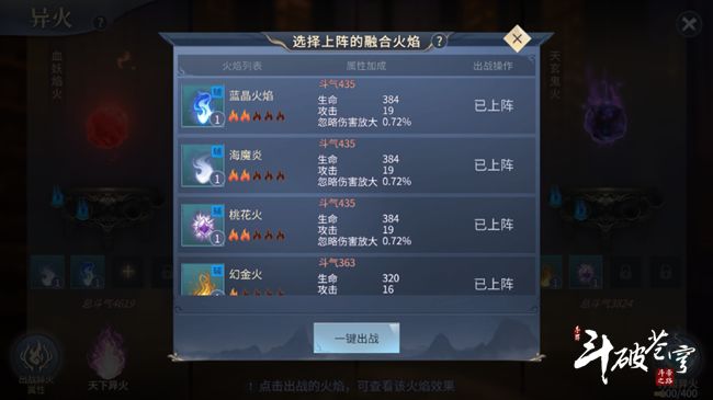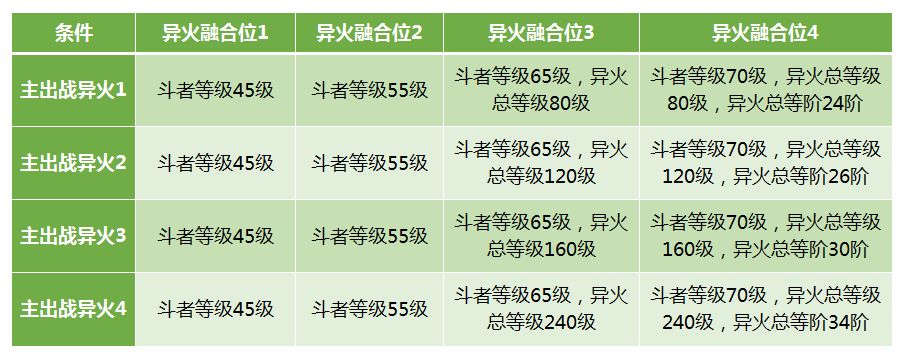 每人都有四个主出战异火,每个主出战异火都有4个对应的融合异火位。融合位解锁后,可将多余的异火在融合位出战,会对该位置出战的异火增加大量的属性和斗气。