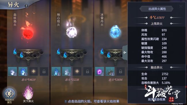 升级和进阶辅位出战的异火也能带来属性和斗气的提升。与之前相比,大大提升了人物的属性和斗气。毕竟原本只是4种出战异火,而现在有20种出战异火,即使化生火与兽火提供的属性点较低,但是加起来也能提升大量属性点。