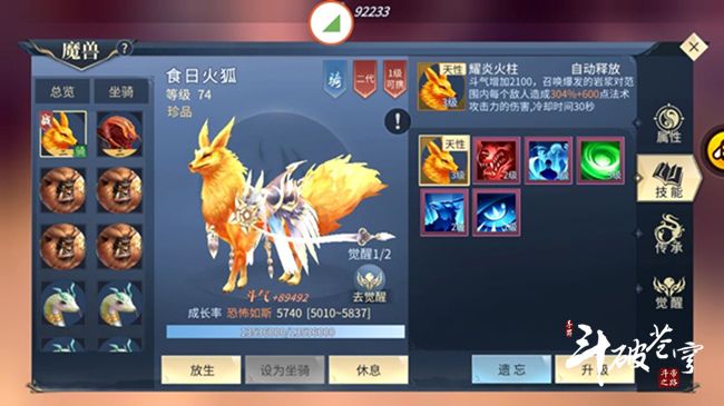 例如食日火狐的技能耀炎火柱:斗气增加2100,召唤爆发的岩浆对范围内每个敌人造成304%+600点法术攻击力伤害,冷却时间30秒。所以在选择食日火狐的技能时应该首选通灵和灵体。