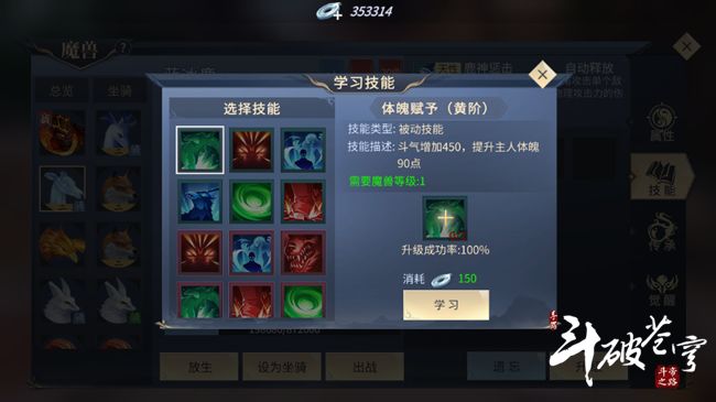 目前来讲,普通魔兽,如吞天蟒、合欢巨猿等,除自身默认技能外只能学习三个技能;而高阶魔兽,如食日火狐、炽焰破山犀等,除自身默认技能外还可以学习五个技能。