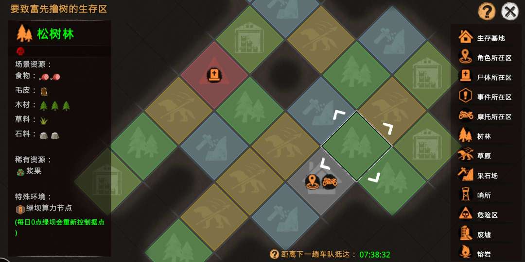 在生存物语中,每个玩家的地图都是随机生成的,目前大概有30个区域组成,需要玩家探索才会显示在世界地图中。在世界地图中可以查看地图资源的种类,危险级别,稀有资源,以及特殊环境。