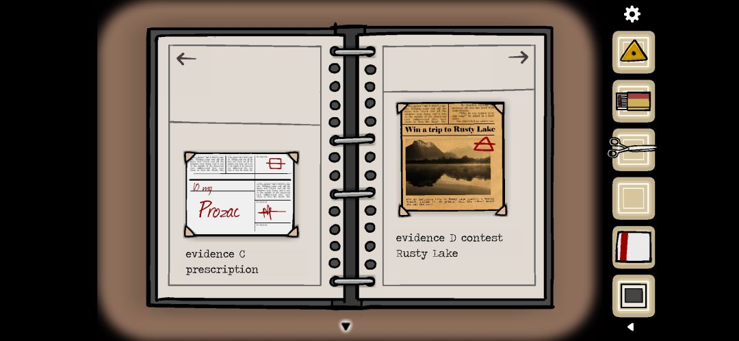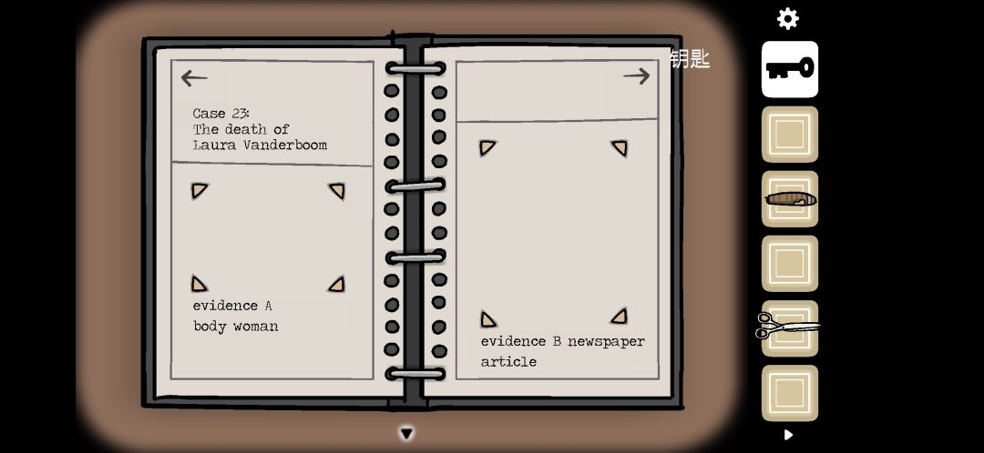 打开档案本,发现与23号案件相关的五个证据处,都是空白的,应该需要我们去补全。