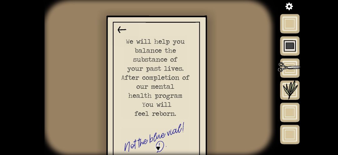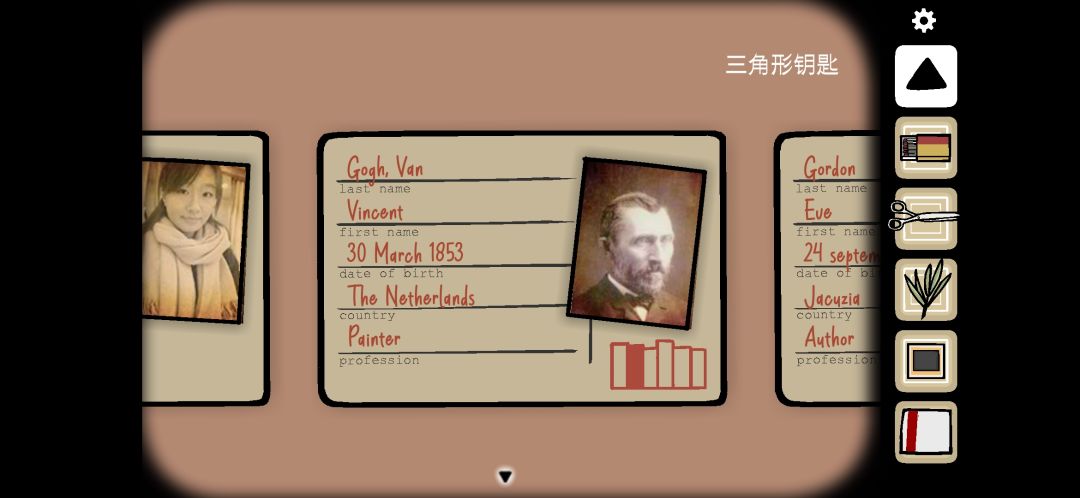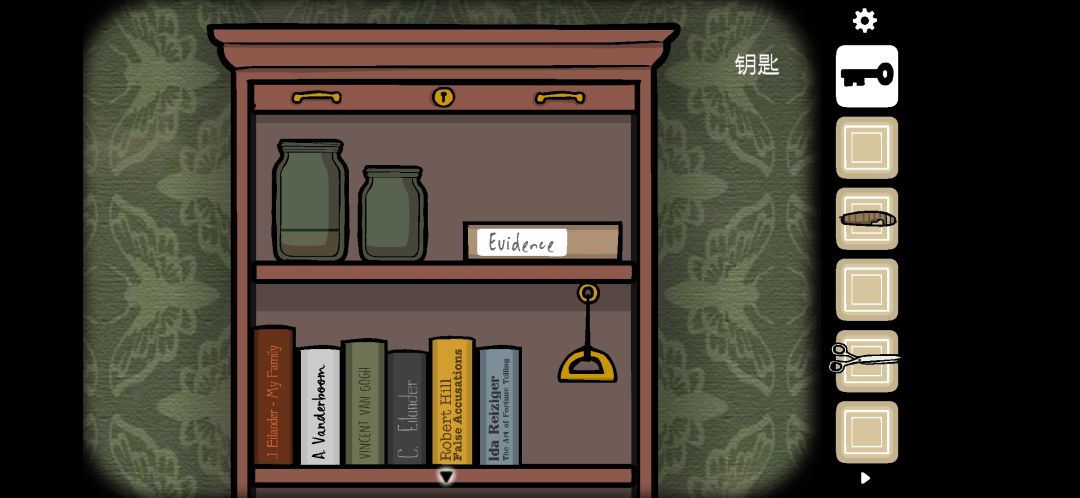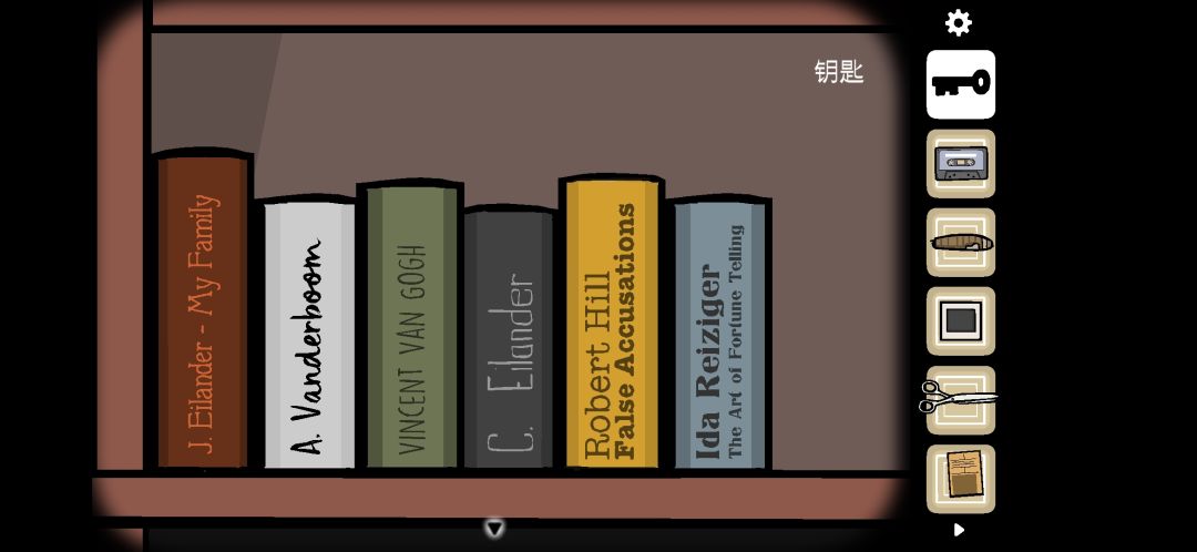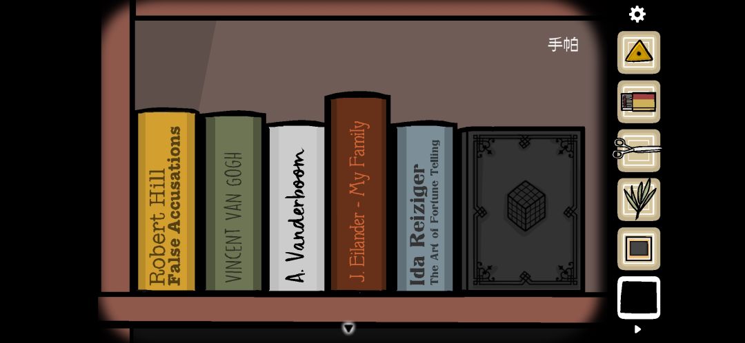 按照名片信息对书进行排序,最后一本黑色的书可以打开了。阅读过后,从书里能看到不少前作系列的信息,并得到一只玻璃眼睛和金属方块。