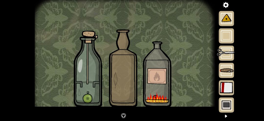 回到地球仪这里,用火柴引燃第三个瓶子,瓶子受热炸碎后可以拿出鱼钩来。将线、鱼钩、瓶塞组合,并倒入水。成功拿出玻璃眼睛。