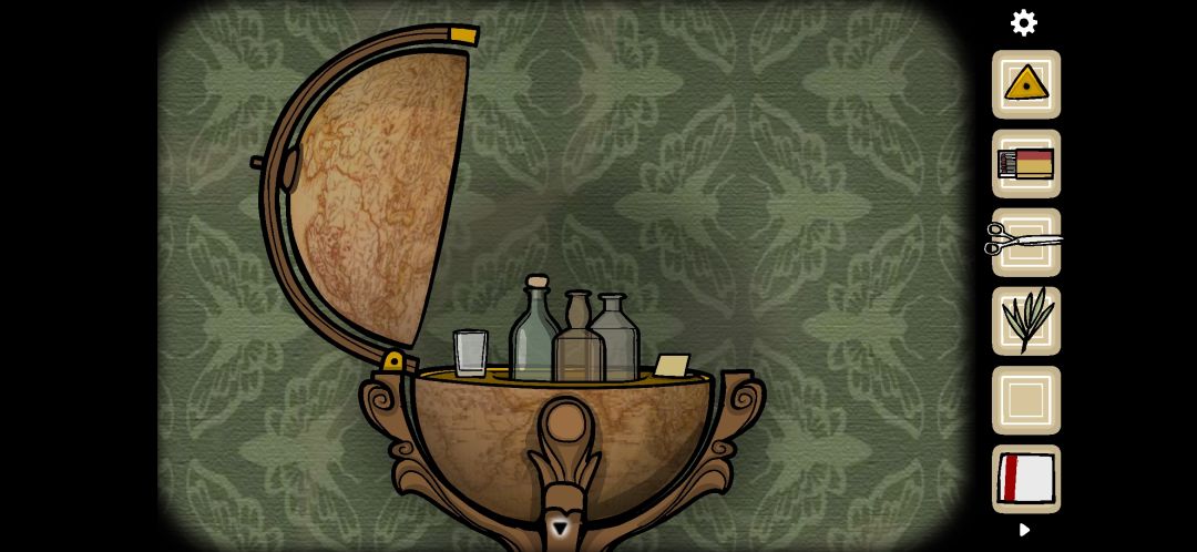 解完迷题后,地球仪打开。得到玻璃杯,证据d,以及三个瓶子。瓶子里分别装着另一只绿眼睛。将之前剪下的叶子喂给蚕宝宝,然后它就化成扑棱蛾子飞走了,跟着它走。