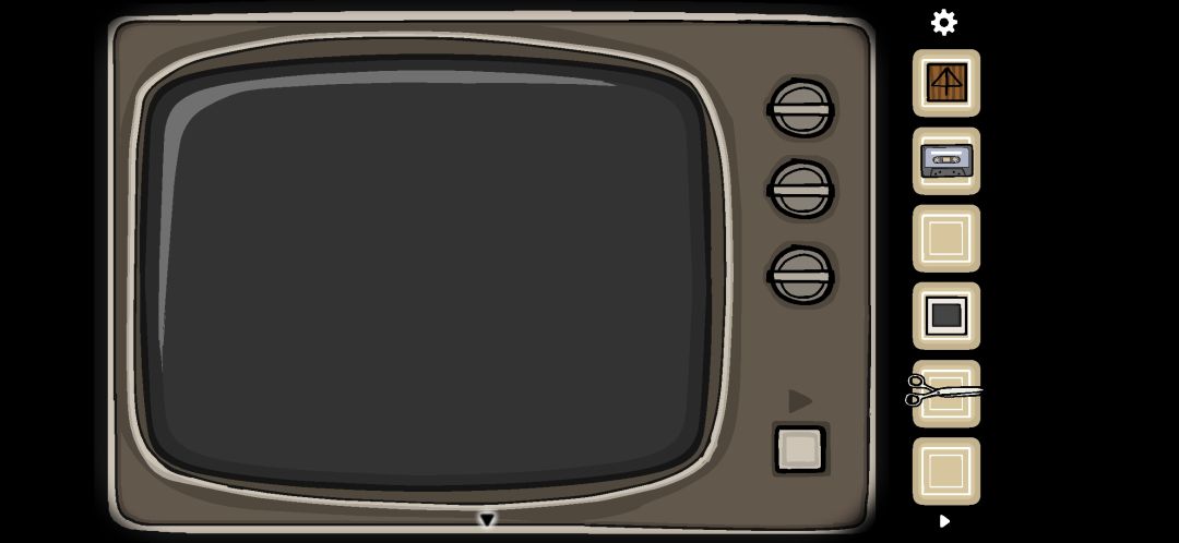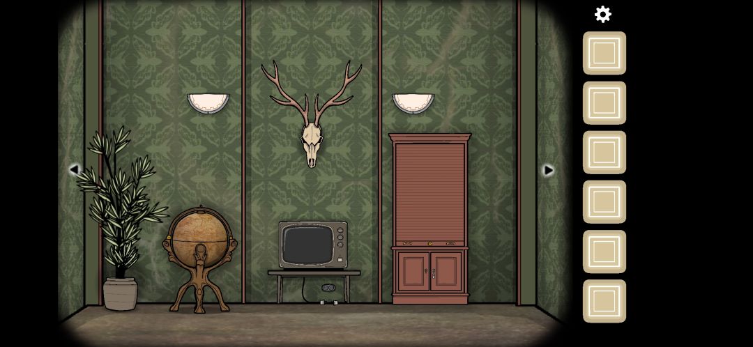 ①号场景。粗略观察,首先映入眼帘的是墙上的鹿头,是绣湖系列的常客了。桌子上一台电视机,不过连接线断掉了。一盆绿植,叶子很像锈湖旅馆里的迷迭香。除此之外立柜三个空间均被锁上了,一个需要密码,两个需要钥匙🔑。地球仪也暂时无法打开。(这里可以先把地上那个好的插头插到插座里)