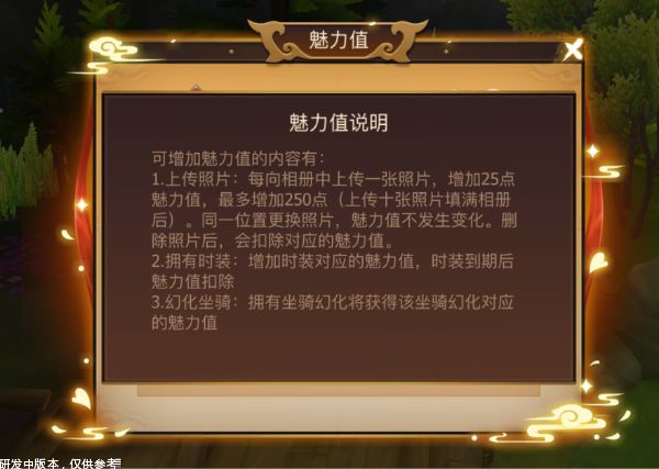 魅力值系统是从老版本继承而来的老系统,反映了角色整体的魅力,主要通过各种外观系统进行培养。